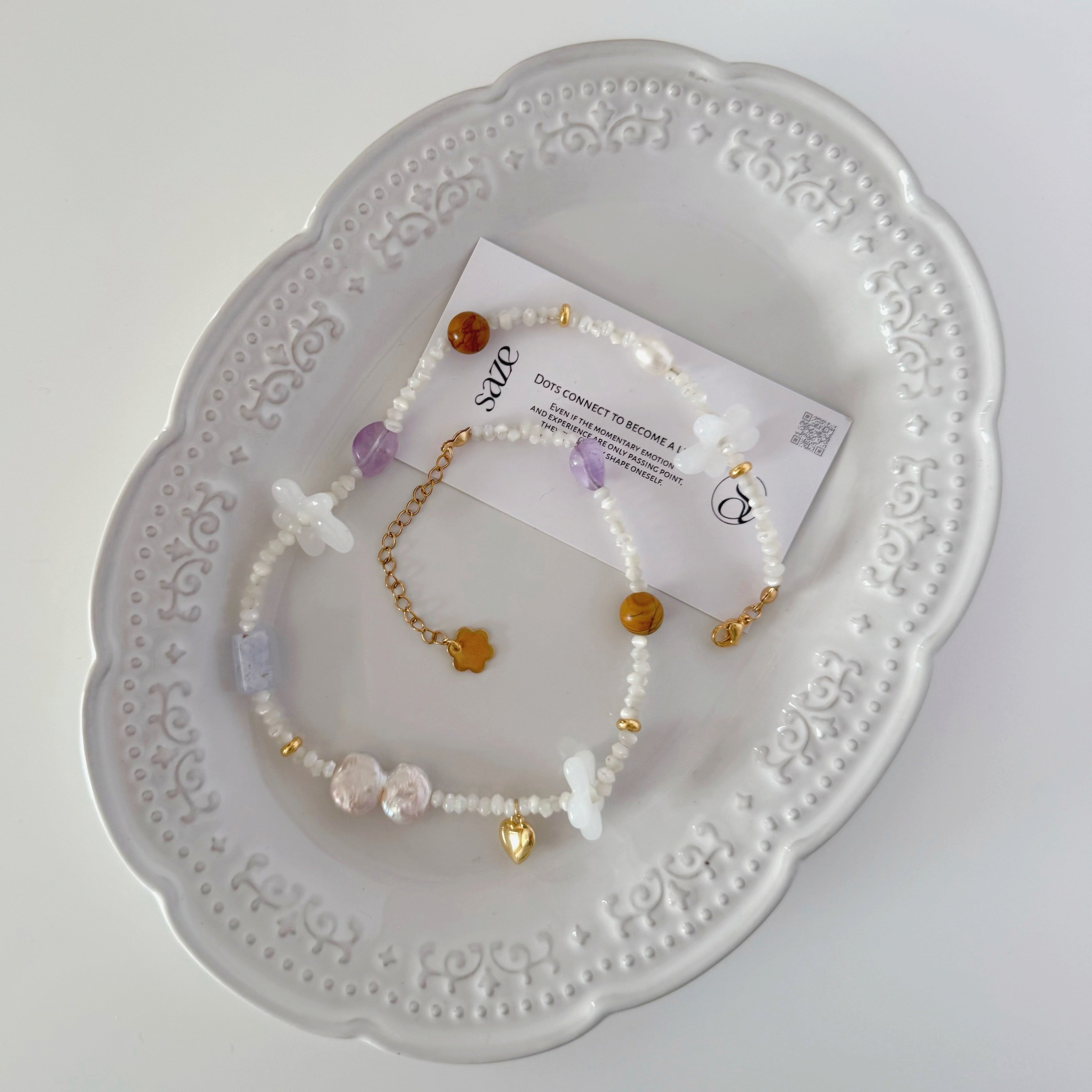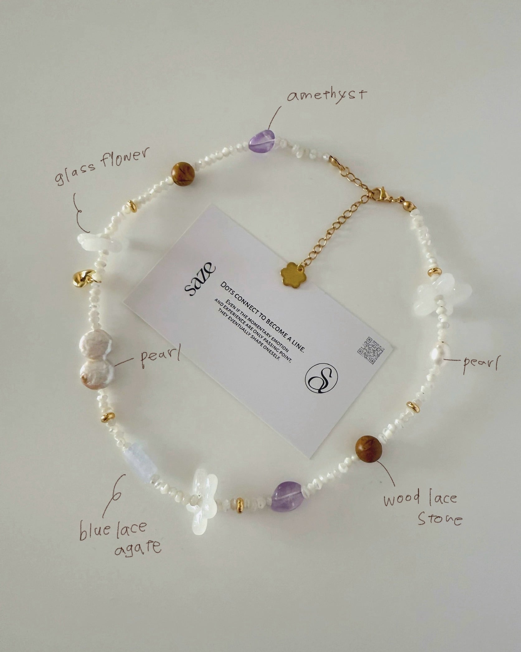 (ビーズ)シェル、ブルーレースアゲート、アメジスト、淡水パール、ステンレス、ガラス、ウッドレースストーン(金具)ステンレス