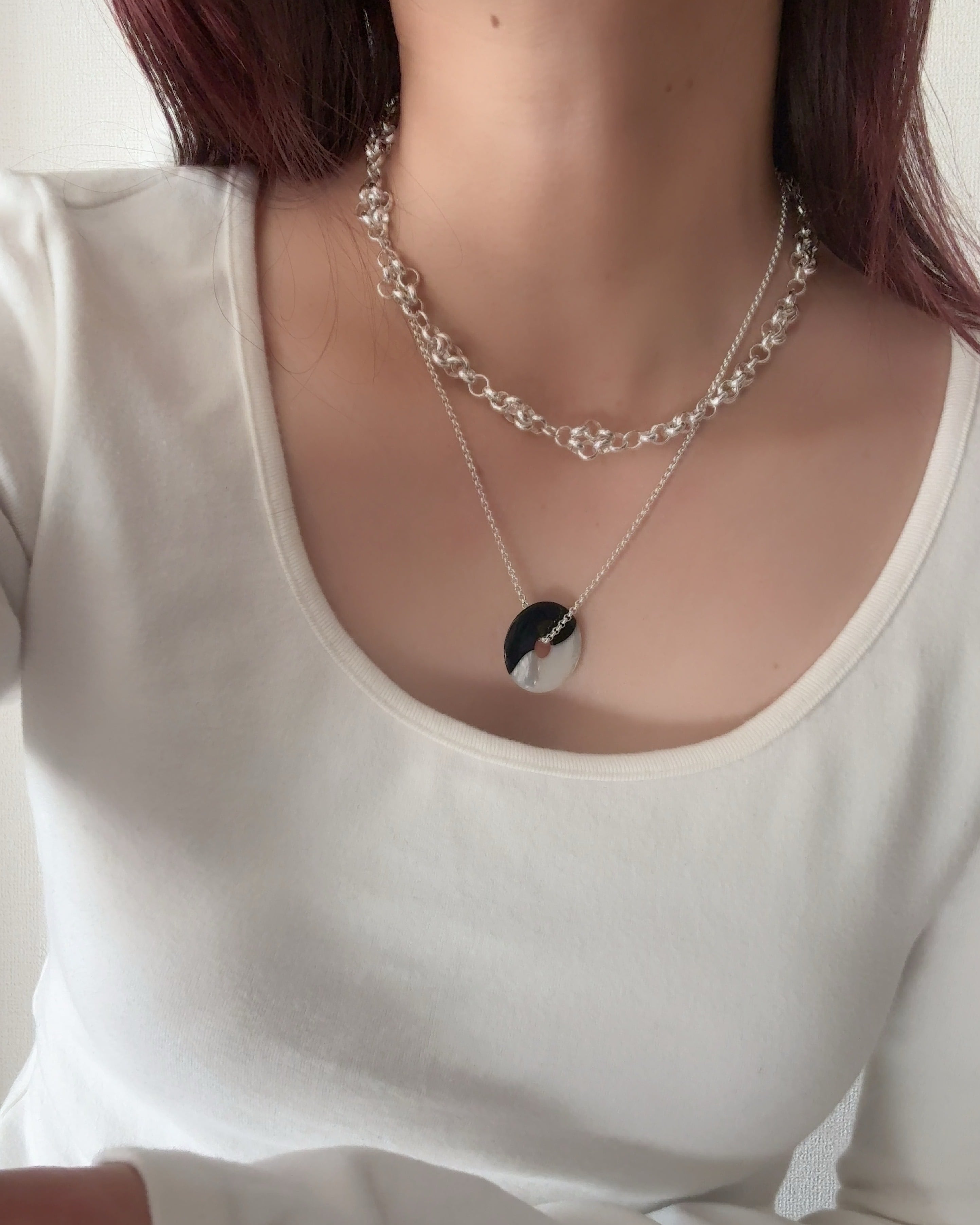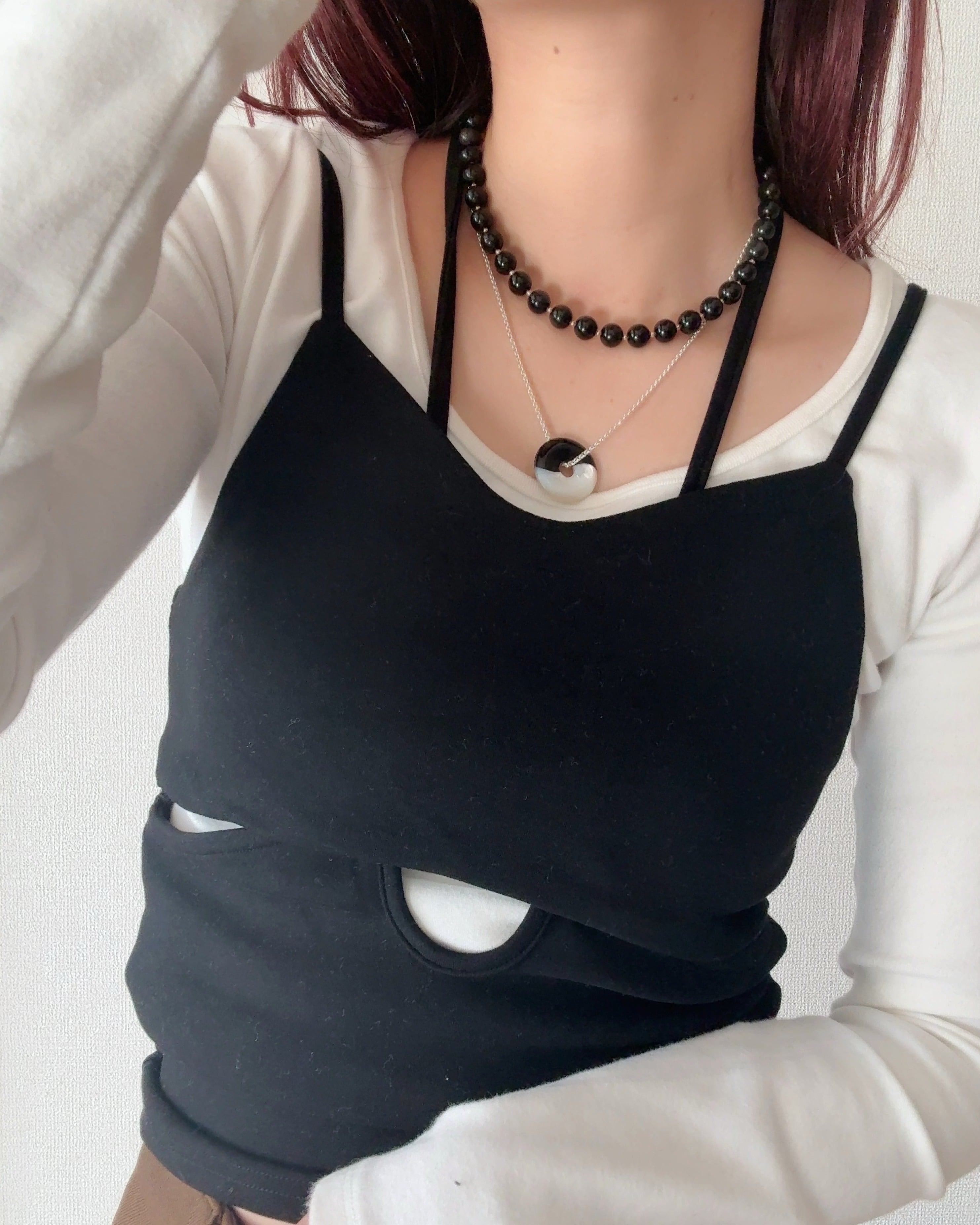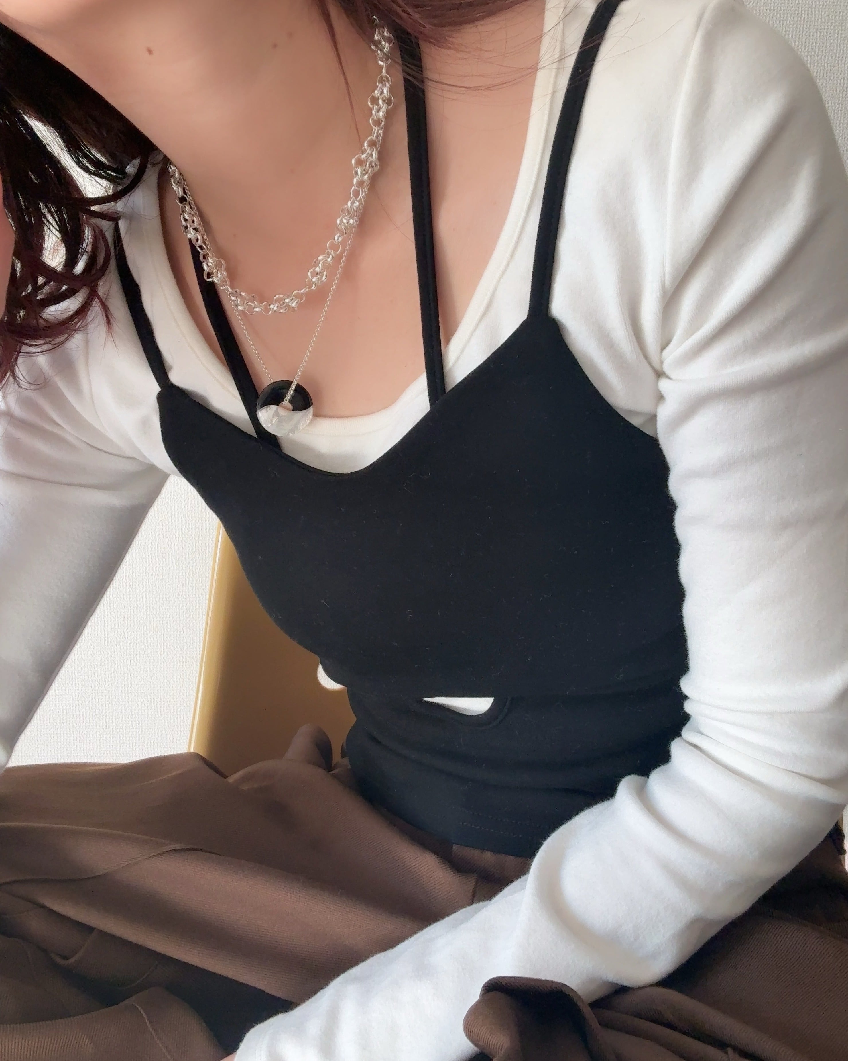長めのチェーンを合わせているので胸元のポイントにぴったり!