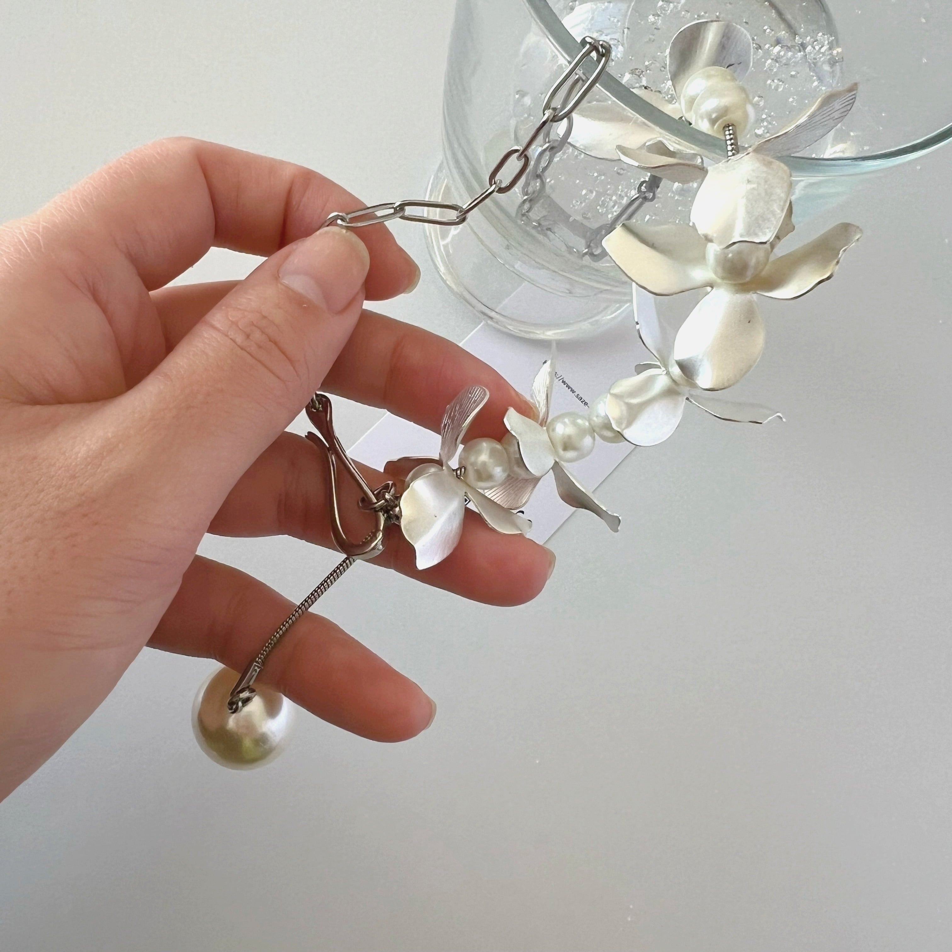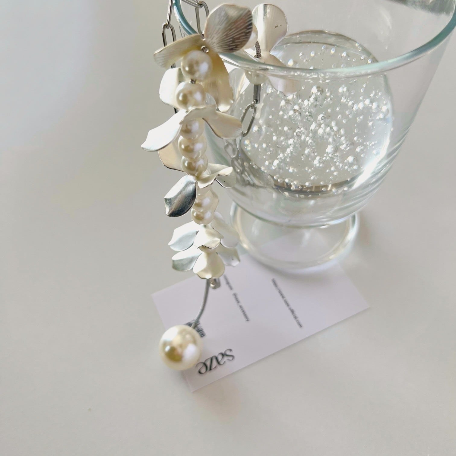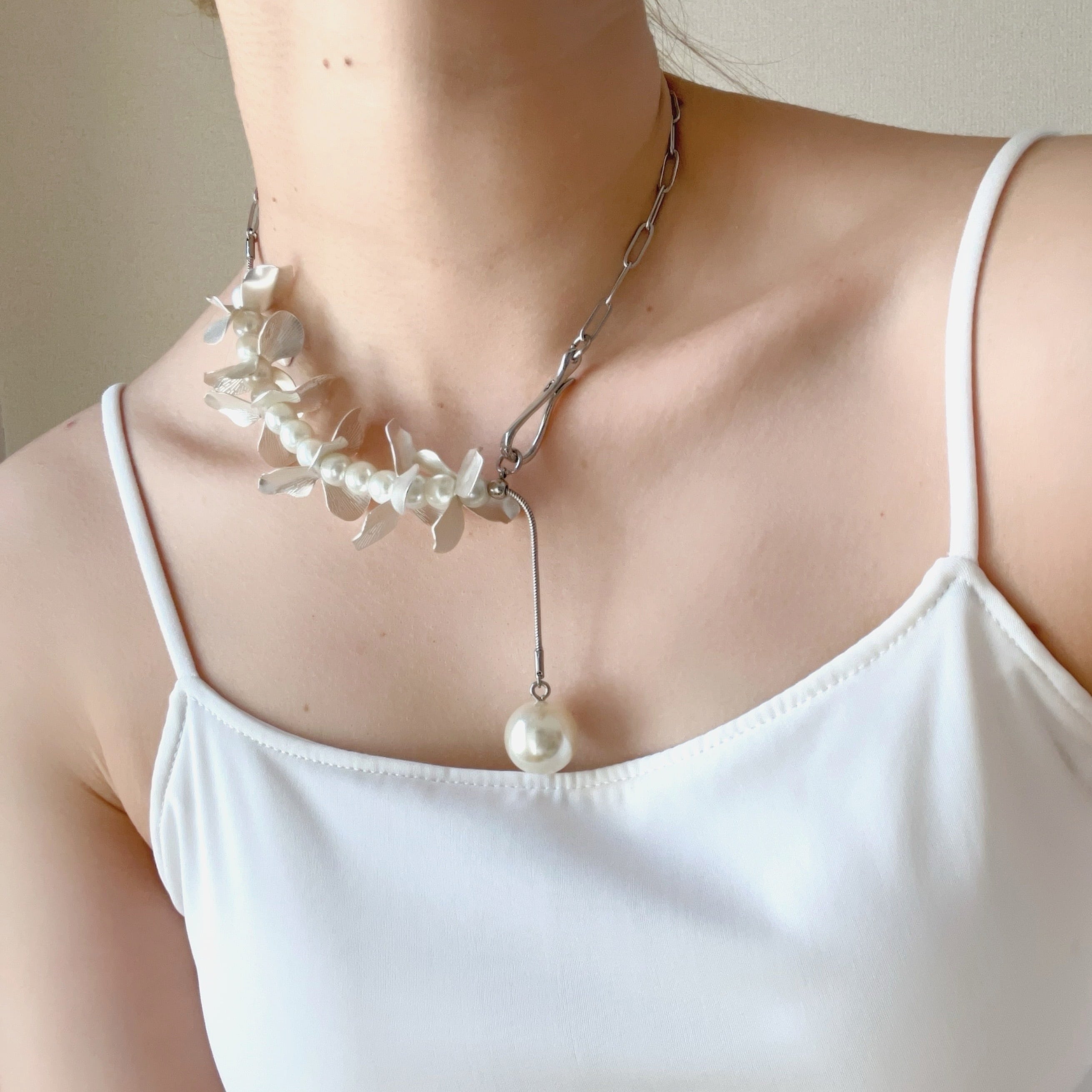 メタル素材の花びらをプラスティックパールと組み合わせ